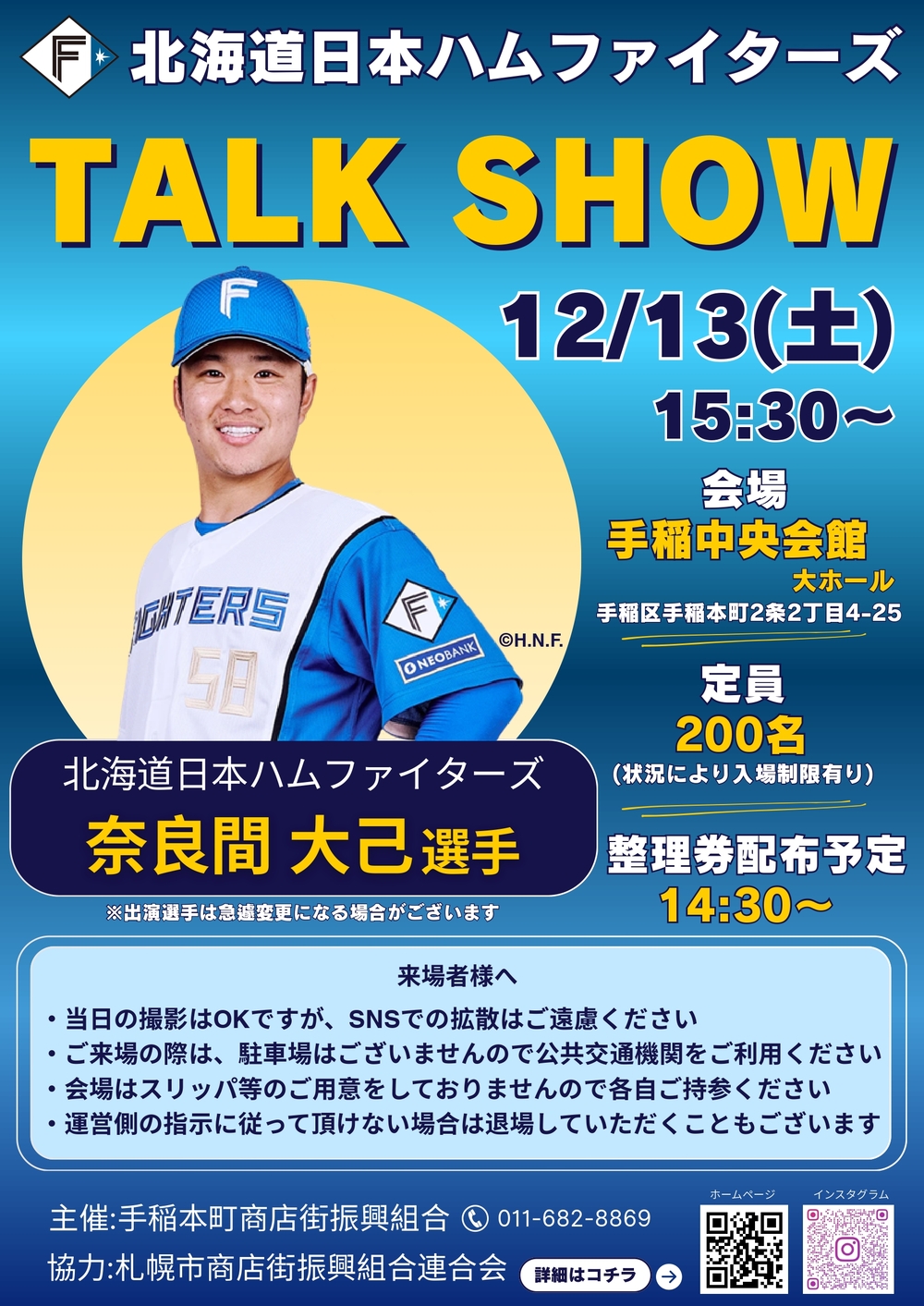 日本ハムファイターズ選手 奈良間 大己選手のトークショーを行います。