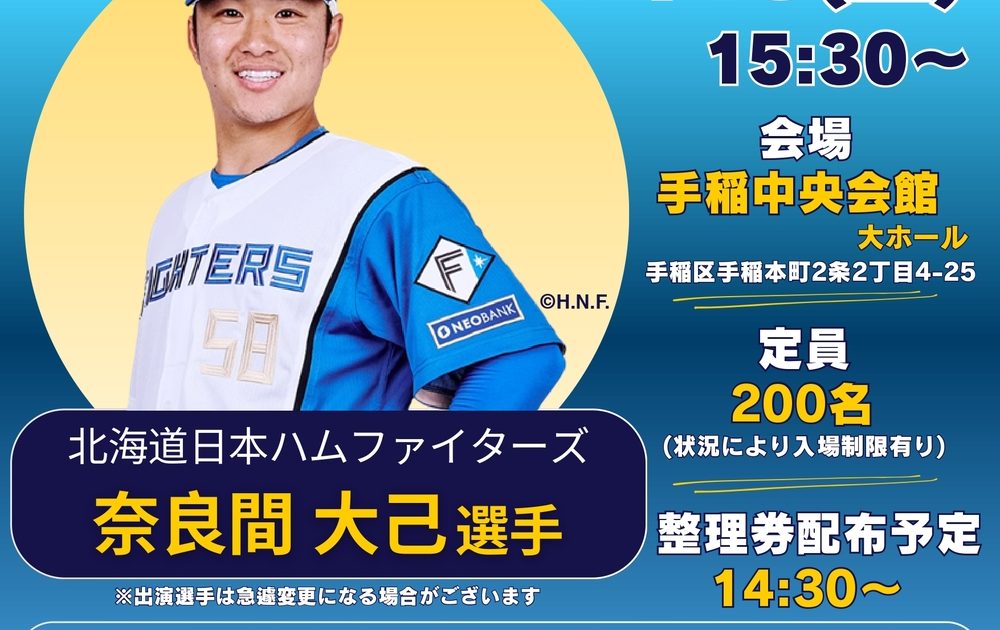 日本ハムファイターズ選手 奈良間 大己選手のトークショーを行います。 開催日時:12月13日(土)午後15時30分~ 開催場所:手稲中央会館 手稲区手稲本町2条2丁目4-25 定員:200名(14時30分から整理券を配布 […]